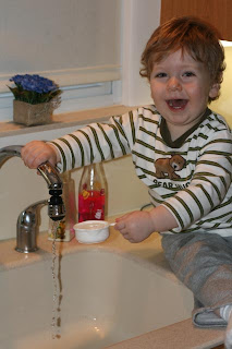 For the past month or so, Zackary has had a real fascination with water. Today I decided to put the step stool up to the washer and have him help me put the laundry in. He would put them in one by one, I did ask him to not put them all in the same place, but otherwise he was very helpful.